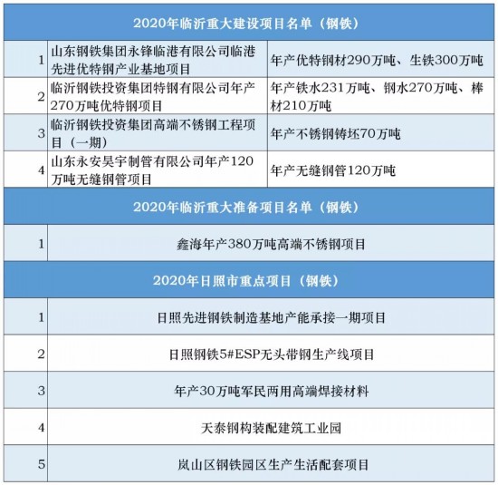 近日,臨沂、日照相繼公布了2020年重大建設(shè)項目名單。根據(jù)山東省此前印發(fā)的《山東省先進鋼鐵制造產(chǎn)業(yè)基地發(fā)展規(guī)劃(2018-2025年)》,山東省將著力打造日—臨沿海先進鋼鐵制造產(chǎn)業(yè)基地、萊—泰內(nèi)陸精品鋼生產(chǎn)基地,加快建設(shè)日照先進鋼鐵制造產(chǎn)業(yè)集群、臨沂臨港高端不銹鋼與先進特鋼制造產(chǎn)業(yè)集群、萊蕪精品鋼和400系不銹鋼產(chǎn)業(yè)集群、泰安特種建筑用鋼產(chǎn)業(yè)集群。在臨沂、日照此次公布的2020年重大建設(shè)項目中就包括多項鋼鐵項目,具體情況整理如下: