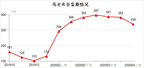 4月上旬,線材庫(kù)存339萬(wàn)噸,比上一旬減少42萬(wàn)噸,下降11.1%;比上年12月增加236萬(wàn)噸,上升229.1%。