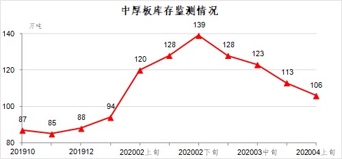4月上旬,中厚板庫(kù)存106萬(wàn)噸,比上一旬減少7萬(wàn)噸,下降6.4%;比上年12月增加18萬(wàn)噸,上升20.5%。