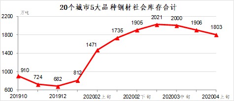4月上旬,20個(gè)城市5大品種鋼材社會(huì)庫(kù)存1803萬(wàn)噸,比上一旬減少103萬(wàn)噸,下降5.4%;比上年12月增加1121萬(wàn)噸,上升164.4%。