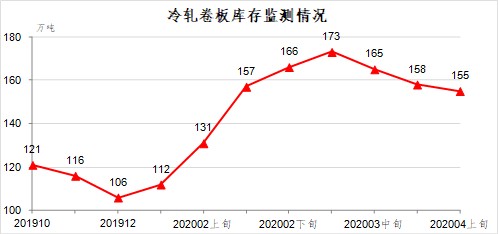 4月下旬,冷軋卷板庫(kù)存155萬(wàn)噸,比上一旬減少4萬(wàn)噸,下降2.4%;比上年12月增加49萬(wàn)噸,上升46.2%。