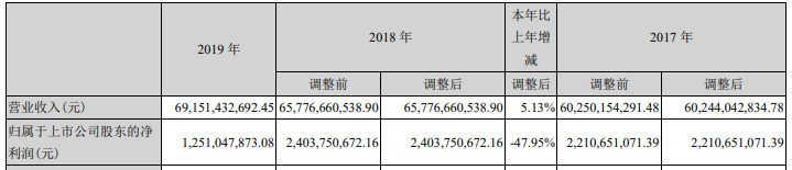 公司2019年實現(xiàn)歸屬于上市公司股東的凈利潤12.51億元,同比下降47.95%。