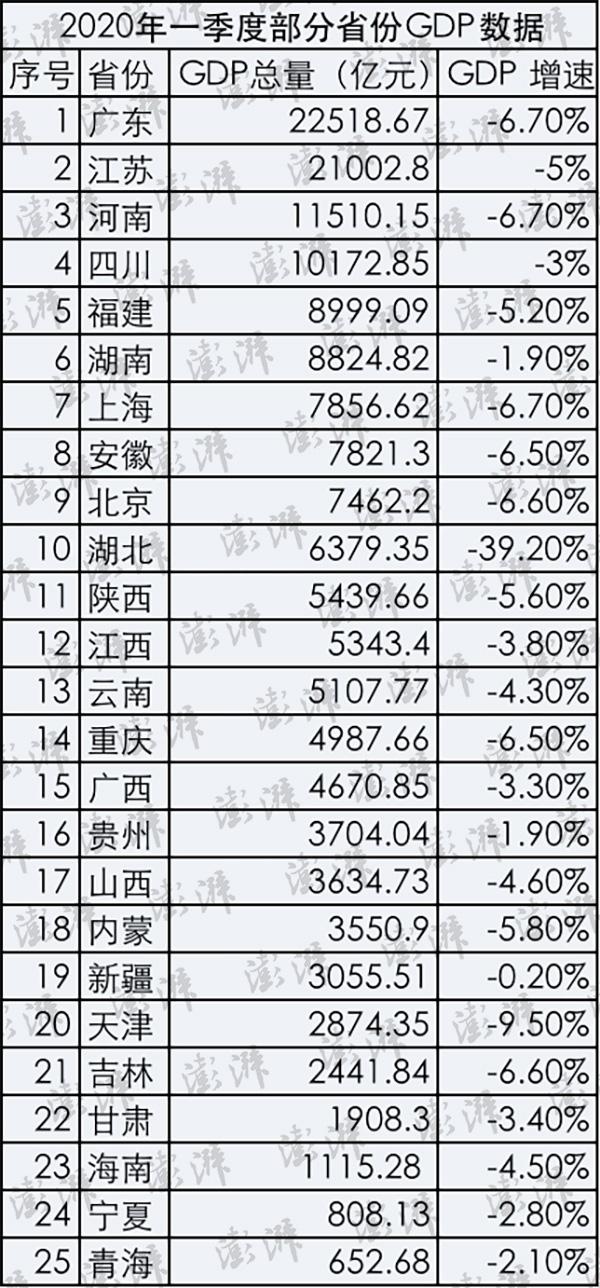 從GDP增速來看,25個(gè)省份中,除湖北和天津外,有23個(gè)省份的增速超過了全國一季度-6.8%的數(shù)據(jù)。其中新疆一季度GDP增速暫列全國第一,同比下降0.2%,增速高于全國6.6個(gè)百分點(diǎn)。此外還有湖南、貴州、青海、寧夏等省份,一季度GDP增速高于-3%。