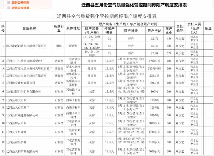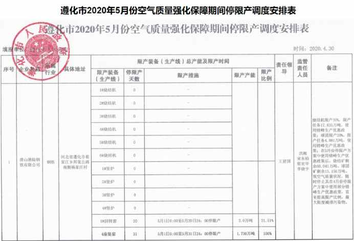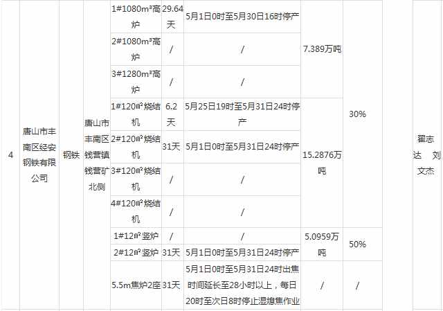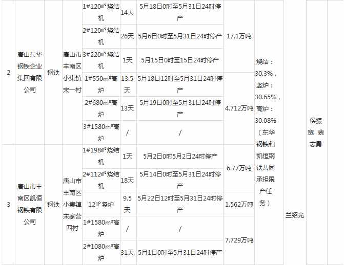 近日,河北省唐山市各地方政府陸續(xù)發(fā)布《5月份空氣質(zhì)量強(qiáng)化管控期間停限產(chǎn)調(diào)度安排表》,鋼企方面,涉及津西、建龍、瑞豐、東華、凱恒、經(jīng)安等多家鋼企,限產(chǎn)產(chǎn)能達(dá)142萬噸。焦化方面,涉及達(dá)豐、港陸、建龍焦化影響程度不一。具體明細(xì)如下: