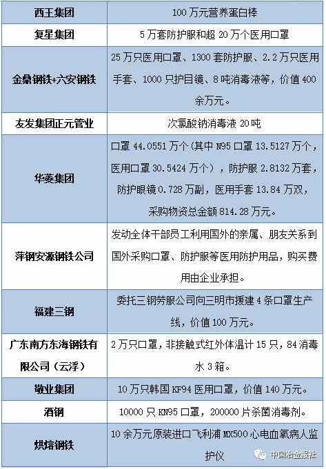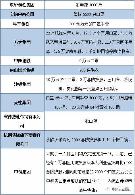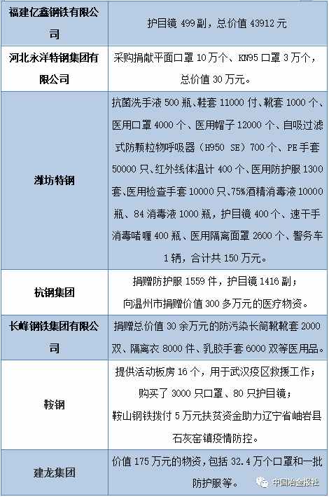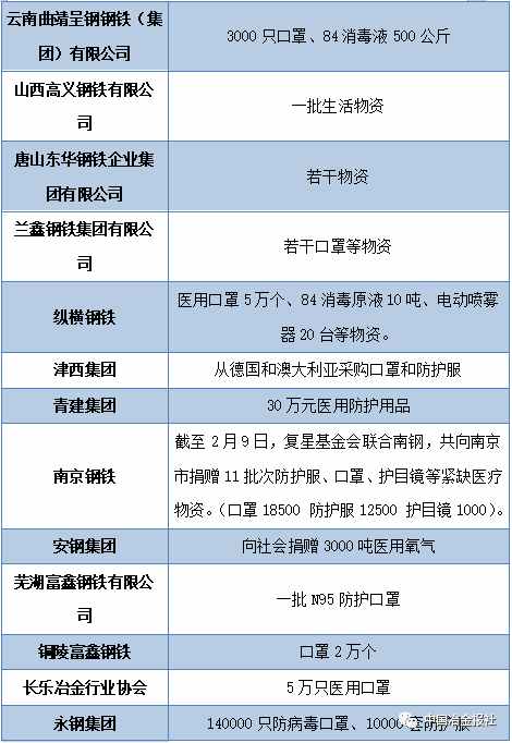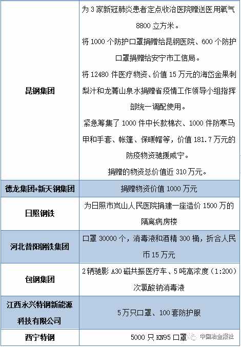 當前疫情防控形勢持續(xù)向好,經濟社會生活正在逐步恢復正常。自新型冠狀病毒感染的肺炎疫情發(fā)生以來,鋼鐵行業(yè)廣大企業(yè)在做好自身工作同時,積極投身到全國抗擊疫情工作當中。據中國冶金報、中國鋼鐵新聞網小編不完全統(tǒng)計,疫情發(fā)生以來,中國鋼鐵企業(yè)捐款和鋼企員工、黨員捐款總數已經超過17億元。!此外,鋼企在捐助抗疫物資,穩(wěn)產保供等方面也做出了巨大的貢獻。(見下表)