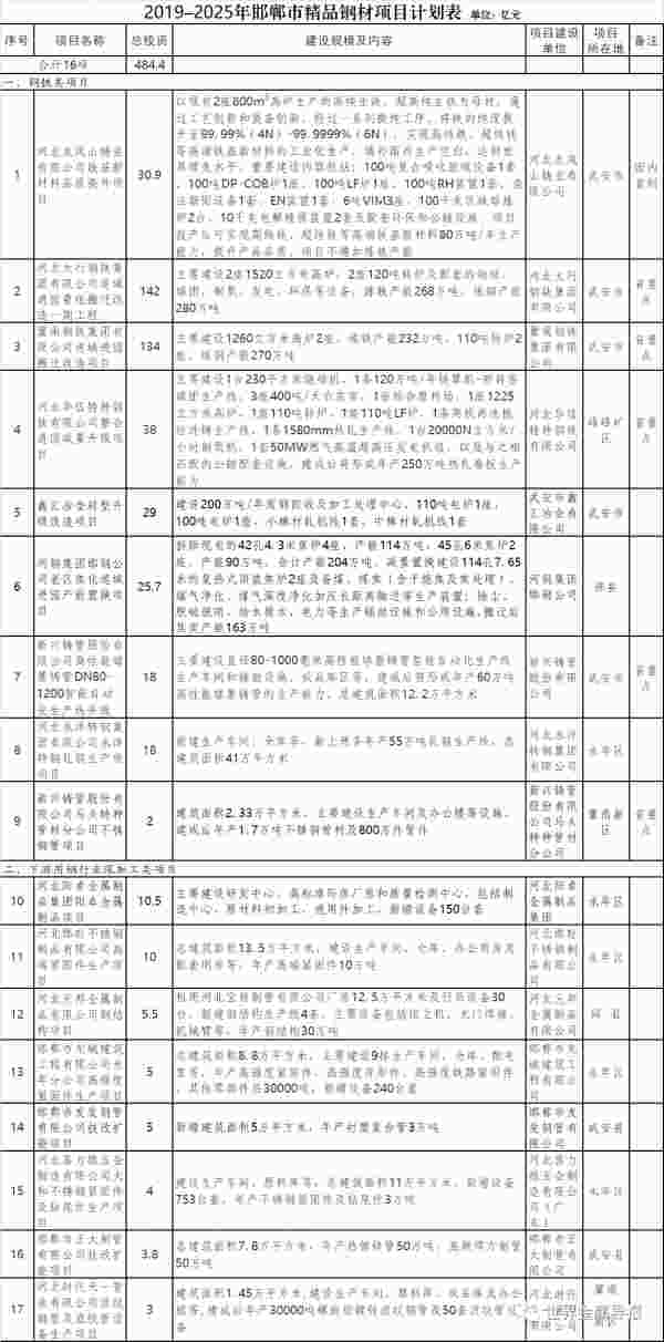 附件部分:梳理并列出2019—2025年邯鄲市精品鋼材項目計劃表。