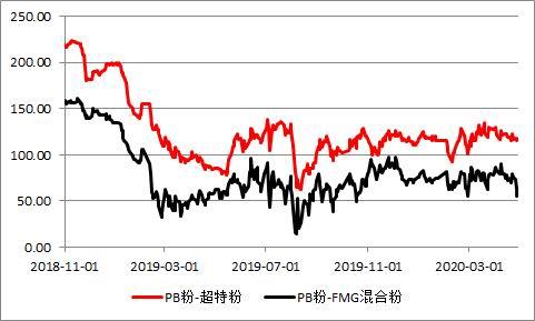 4月PB粉與超特粉、FMG混合粉的價(jià)差震蕩小幅收窄,因鐵礦石現(xiàn)貨價(jià)格明顯上漲,鋼廠在成材價(jià)格沒(méi)有明顯漲幅及考慮成本的情況下,在采購(gòu)上更多選擇中低品礦。