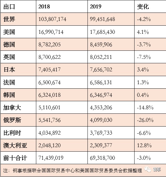 2019年,世界廢鋼出口量為9945萬噸,同比減少4.2%;美國為世界最大的廢鋼出口國,2019年出口量為1768萬噸,占比為18%,德國、英國和日本等國家緊隨其后,前十大出口國共出口6931萬噸,同比減少3%,占總出口量的比例為70%,比2018年提高1個百分點。