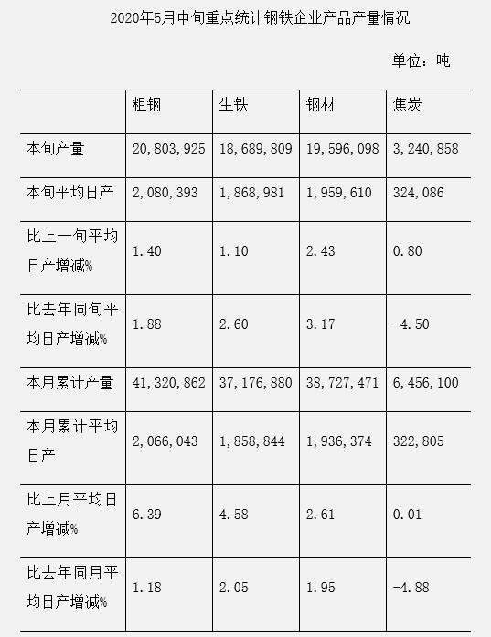 核心提示:2020年5月中旬,重點(diǎn)統(tǒng)計(jì)鋼鐵企業(yè)共生產(chǎn)粗鋼2080.39萬(wàn)噸、生鐵1868.98萬(wàn)噸、鋼材1959.61萬(wàn)噸、焦炭324.09萬(wàn)噸。本旬平均日產(chǎn),粗