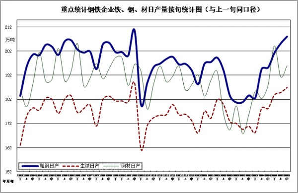 根據(jù)重點(diǎn)統(tǒng)計(jì)鋼鐵企業(yè)產(chǎn)量估算,本旬全國(guó)共生產(chǎn)粗鋼2758.95萬(wàn)噸,日產(chǎn)粗鋼275.89萬(wàn)噸、環(huán)比增長(zhǎng)1.27%、同比下降2.464.56%;生產(chǎn)生鐵2299.61萬(wàn)噸,日產(chǎn)生鐵229.96萬(wàn)噸、環(huán)比增長(zhǎng)0.83%、同比下降2.57%;生產(chǎn)鋼材3352.99萬(wàn)噸,日產(chǎn)鋼材335.30萬(wàn)噸、環(huán)比增長(zhǎng)2.78%、同比增長(zhǎng)1.98%。本月累計(jì)平均日產(chǎn),全國(guó)粗鋼環(huán)比下降0.15%、同比下降0.05%,生鐵環(huán)比增長(zhǎng)0.56%、同比增長(zhǎng)2.15%,鋼材環(huán)比下降1.30%、同比增長(zhǎng)6.66%。