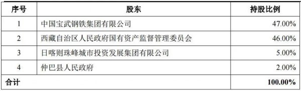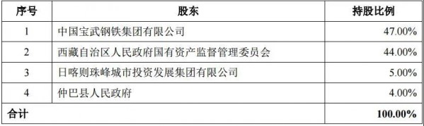 從《公告》獲悉,中國(guó)寶武、日喀則城投、仲巴縣政府?dāng)M以現(xiàn)金形式對(duì)礦業(yè)總公司改制后設(shè)立的有限責(zé)任公司進(jìn)行增資,屆時(shí)中國(guó)寶武將成為其第一大股東,持股比例為47%。