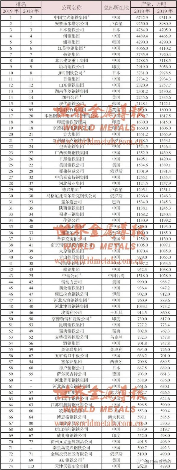 2019年粗鋼產(chǎn)量排名前十的鋼鐵企業(yè)名稱沒(méi)有變化,但其中四家企業(yè)位次有所調(diào)整。最大的變化是中國(guó)寶武鋼鐵集團(tuán)以9312萬(wàn)噸取代安賽樂(lè)米塔爾落座榜首,而后者則由自2006年以來(lái)占據(jù)榜單首名的位置退居次位。寶武集團(tuán)2019年粗鋼產(chǎn)量較2018年大幅增長(zhǎng)38%,主要原因是兼并馬鋼集團(tuán)以及收購(gòu)重慶鋼鐵。此外,寶武集團(tuán)還持有首鋼集團(tuán)少數(shù)股權(quán),首鋼集團(tuán)本次排名第11位。而安賽樂(lè)米塔爾2019年粗鋼產(chǎn)量則同比下降2.9%至8981萬(wàn)噸,其中一個(gè)重要原因是該公司在2019年7月初向英國(guó)利百得集團(tuán)(Liberty
