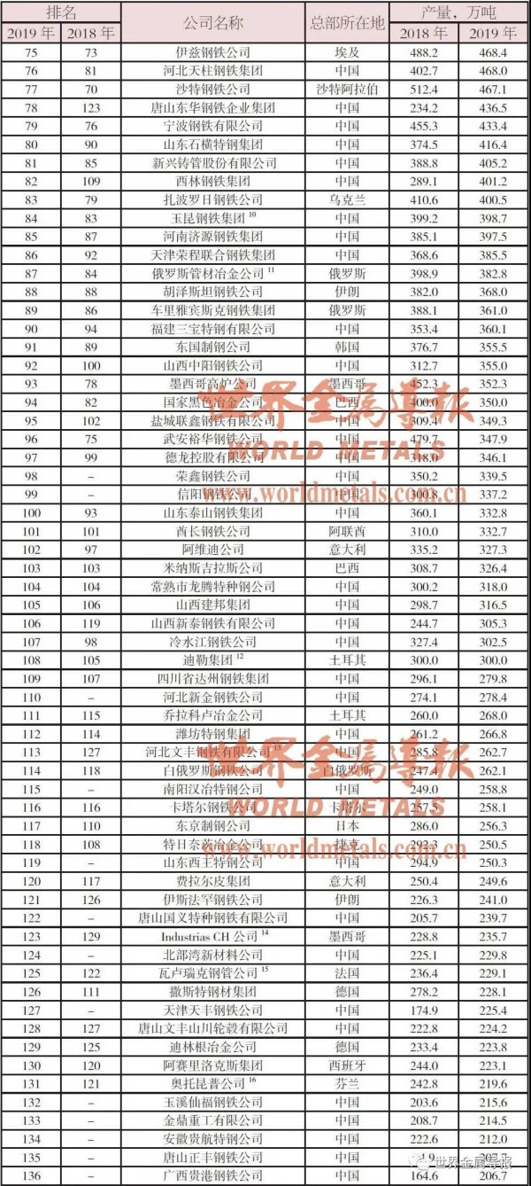 在2019年榜單中,中國(guó)河鋼集團(tuán)、江蘇沙鋼集團(tuán)和鞍鋼集團(tuán)仍分別排名第四、第六和第七,與上年持平;中國(guó)建龍集團(tuán)排名由2018年的第十位上升至第八位,與日本JFE鋼鐵公司近兩年的排名剛好互換。此外,日本制鐵、韓國(guó)浦項(xiàng)和印度塔塔鋼鐵排名仍分別為第三、第五和第九,與上年排名持平。
