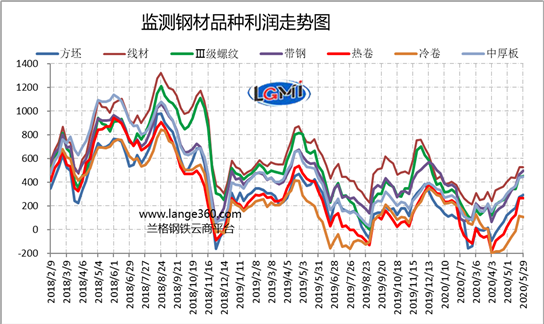 圖2是蘭格鋼鐵云商平臺(tái)監(jiān)測(cè)的各主要鋼材品種的盈利能力曲線對(duì)比。從圖2可以看出,5月份7大品種測(cè)算毛利呈波動(dòng)上升趨勢(shì),各品種與上月相比盈利均有所擴(kuò)張;其中熱軋卷板毛利上升最多,為257元/噸;線材毛利上升最少,為145元/噸,其他品種毛利升幅在167-209元/噸之間。