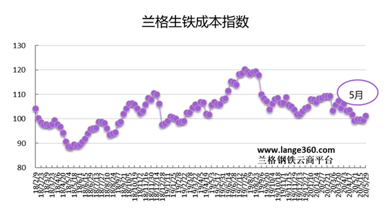 從圖1蘭格生鐵成本指數(shù)走勢(shì)圖可以看出,5月份的生鐵成本指數(shù)小幅波動(dòng),全月均值較上月下降2.7%。