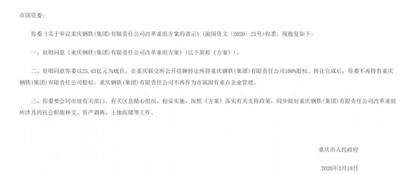 2020年3月20日,重慶市人民政府發(fā)布關(guān)于重慶鋼鐵 (集團(tuán))有限責(zé)任公司改革重組方案的批復(fù),同意重慶市國資委以25.63億元為底價,公開掛牌轉(zhuǎn)讓所持有的重慶鋼鐵(集團(tuán))有限責(zé)任公司100%股權(quán)。按照《方案》落實有關(guān)支持政策,重慶市國資委將同步做好重慶鋼鐵(集團(tuán))有限責(zé)任公司改革重組所涉及的社會職能移交、資產(chǎn)剝離、土地收儲等工作。