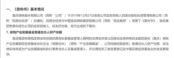 2019年12月27日晚間,重慶鋼鐵發(fā)布公告,公司于2019年12月27日收到公司實際控制人四源合股權(quán)投資管理有限公司(下稱“四源合投資”)的通知,四源合投資與中國寶武簽署了《意向書》,中國寶武有意向成為公司的實際控制人。