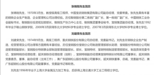 公告顯示,張錦剛等全部來自中國寶武,張錦剛為中國寶武副總經(jīng)理,黨委常委。