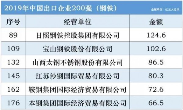 在2019年中國出口企業(yè)200強中,共有6家鋼鐵企業(yè)入圍:附全名單