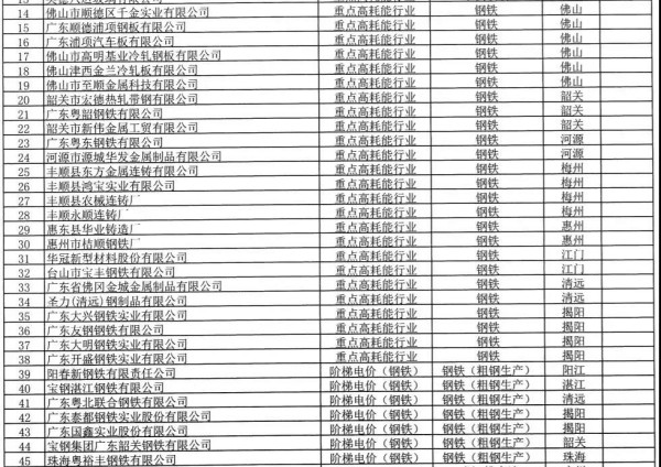 6月22日,廣東省工業(yè)和信息化廳發(fā)布《關(guān)于下達(dá)2020年廣東省節(jié)能監(jiān)察任務(wù)的通知》(以下簡(jiǎn)稱“《通知》”)。《通知》稱,2020年廣東省安排平板玻璃、鋼鐵(不含粗鋼生產(chǎn))行業(yè)強(qiáng)制性單位產(chǎn)品能耗限額標(biāo)準(zhǔn)執(zhí)行情況專項(xiàng)監(jiān)察38家,鋼鐵(粗鋼生產(chǎn))、水泥企業(yè)階梯電價(jià)政策執(zhí)行專項(xiàng)監(jiān)察168家,需在10月30日前完成。其中包括32家鋼鐵企業(yè),具體整理如下: