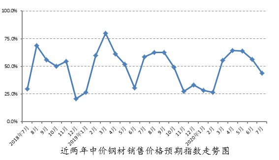7月鋼材批發(fā)市場(chǎng)銷(xiāo)售量預(yù)期指數(shù)、庫(kù)存量預(yù)期指數(shù)分別為46.9%、57.1%,分別下降7.0個(gè)和上漲17.4個(gè)百分點(diǎn),且分處于50%分界線上下方,反映出各方預(yù)計(jì)鋼材銷(xiāo)售形勢(shì)或?qū)⑥D(zhuǎn)淡,而庫(kù)存則相應(yīng)趨于增長(zhǎng)。