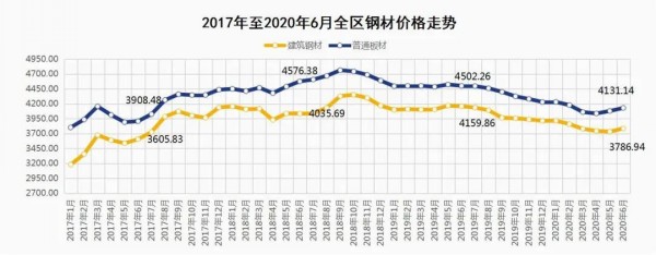 6月份,在季節(jié)性旺季和趕工帶來(lái)的雙重需求之下,工地加快施工進(jìn)度,開(kāi)工率大幅攀升,鋼材出貨量屢創(chuàng)新高,市場(chǎng)需求進(jìn)一步回暖。與此同時(shí)鐵礦石、焦炭等原材料價(jià)格不斷推高,導(dǎo)致鋼材生產(chǎn)企業(yè)成本重心上移,進(jìn)而又對(duì)鋼材價(jià)格形成較強(qiáng)支撐。因此,6月份建筑鋼材、普通板材全區(qū)綜合平均價(jià)格分別為每噸3786.94元、4131.14元。與2020年5月份相比(下稱環(huán)比),建筑鋼材、普通板材價(jià)格分別小幅上漲1.45%、1.27%;與2019年6月份相比(下稱同比),建筑鋼材、普通板材價(jià)格分別下降8.96%、8.24%。
