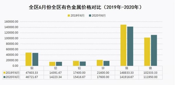 在旺季效應(yīng)帶動(dòng)下,有色金屬消費(fèi)逐漸回暖,一大批項(xiàng)目開(kāi)工建設(shè),市場(chǎng)上訂單逐步反彈,6月份全區(qū)有色金屬價(jià)格全線上漲。其中,銅(1#電解銅,陰極銅)、鋁(AOO 鋁錠)、鉛(1#鉛錠)平均銷售價(jià)格分別為每噸46721.67元、14223.34元、15416.67元。環(huán)比,銅、鋁、鉛價(jià)格分別上漲6.60%、3.73%、3.64%;同比,銅、鋁、鉛價(jià)格分別下降1.85%、1.17%、11.40%。