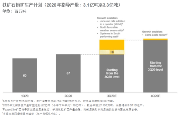 淡水河谷2020年鐵礦石粉礦指導(dǎo)產(chǎn)量保持不變,仍為3.1億噸至3.3億噸,并設(shè)想最大的可能是達(dá)到該范圍的下限。本季度盡管面臨新冠肺炎疫情的影響以及運(yùn)營方面的挑戰(zhàn),季度末期的運(yùn)營業(yè)績?nèi)噪S著雨季結(jié)束而有所提升,6月的單月產(chǎn)量達(dá)到2510萬噸,生產(chǎn)運(yùn)行率達(dá)到7500萬噸/季的水平(包括復(fù)產(chǎn)后的廷博佩巴礦區(qū))。以下因素將助力達(dá)成指導(dǎo)產(chǎn)量:(1)北部系統(tǒng)產(chǎn)量接近2億噸,其中,北嶺(SerraNorte)礦區(qū)生產(chǎn)情況接近2019年下半年水平,S11D礦區(qū)表現(xiàn)穩(wěn)定,東嶺(SerraLeste)礦區(qū)重啟運(yùn)營;(2)伊塔比拉(Itabira)綜合礦區(qū)運(yùn)營將增強(qiáng),該礦區(qū)在第一季度和第二季度分別受到了維修保養(yǎng)和新冠肺炎疫情的影響;(3)Fazend?o礦區(qū)將于第三季度重啟運(yùn)營。