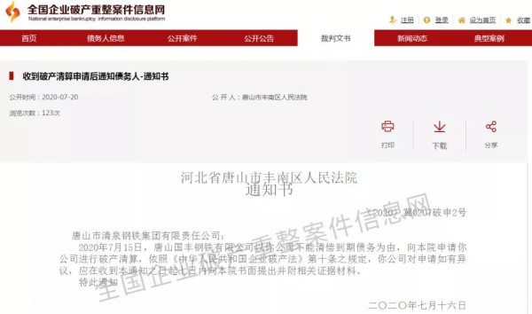 日前,全國企業(yè)破產(chǎn)重整案件信息網(wǎng)顯示,河北省唐山市清泉鋼鐵集團(tuán)有限公司被申請破產(chǎn)清算。