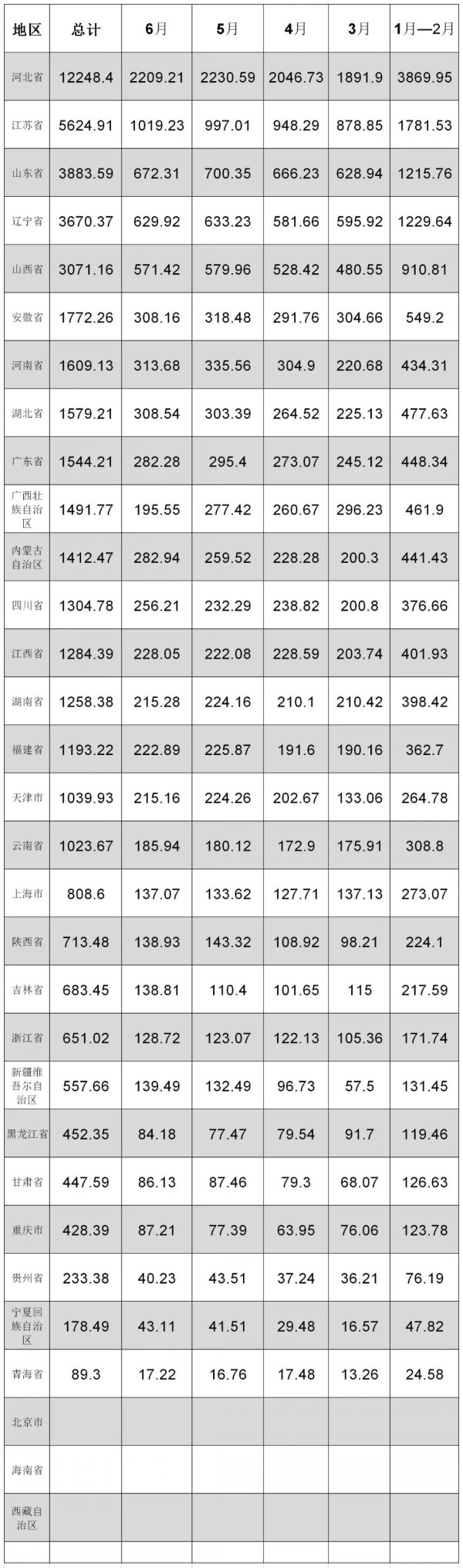 2020年上半年各省市區(qū)粗鋼產(chǎn)量具體如下: