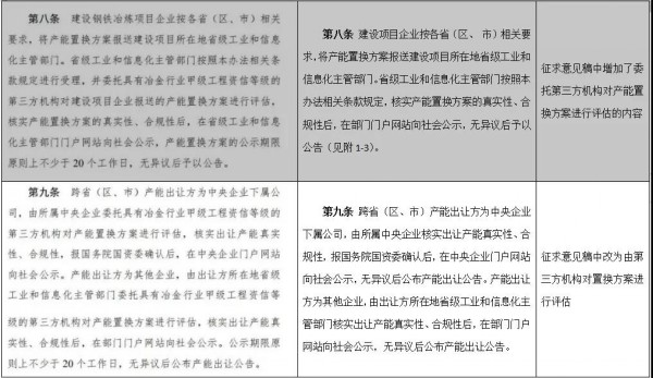 從該通知看到,《鋼鐵行業(yè)產(chǎn)能置換實施辦法》(征求意見稿)與2018年1月工信部印發(fā)的《鋼鐵行業(yè)產(chǎn)能置換實施辦法》相比,條數(shù)從12條增加到了16條,具體內(nèi)容上也有較多不同之處,如下表所示: