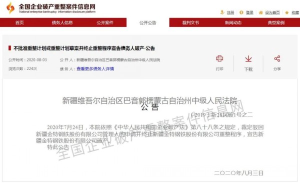 《公告》顯示,2020年7月24日,新疆維吾爾自治區(qū)巴音郭楞蒙古自治州中級人民法院依照《中華人民共和國企業(yè)破產法》第八十八條之規(guī)定,裁定駁回新疆金特鋼鐵股份有限公司管理人的申請并終止新疆金特鋼鐵股份有限公司重整程序,宣告新疆金特鋼鐵股份有限公司破產。