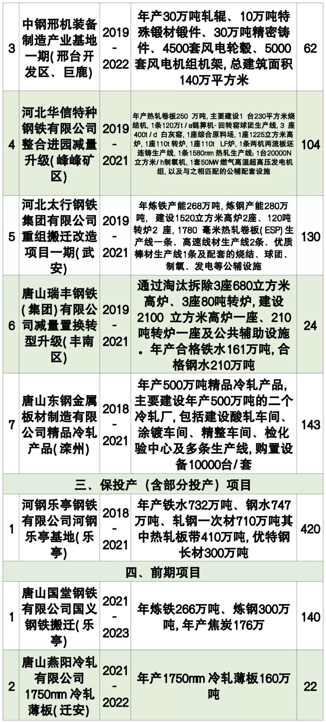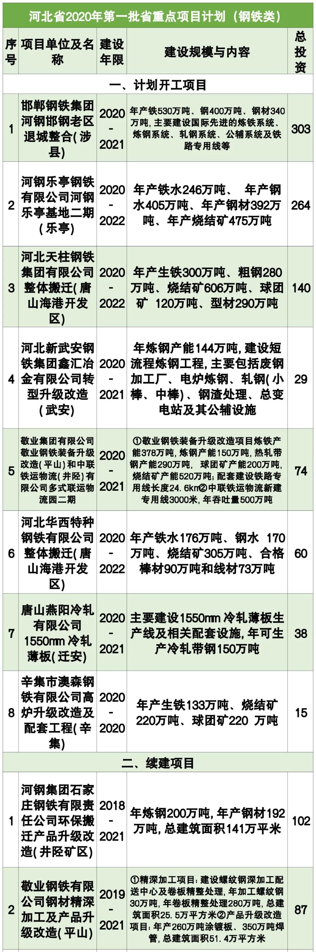 此前,河北省重點(diǎn)建設(shè)領(lǐng)導(dǎo)小組辦公室發(fā)布了第一批《河北省2020年省重點(diǎn)項(xiàng)目計(jì)劃》,共涉及鋼鐵項(xiàng)目18項(xiàng),總投資2157億元。具體項(xiàng)目如下表所示: