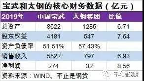 太鋼集團2019年銷售收入797億元、歸母凈利潤22.95億元、總資產1285億元、股東權益547億元。中國寶武2019年銷售收入5522億元、歸母凈利200億元、總資產8622億元、股東權益4171億元。
