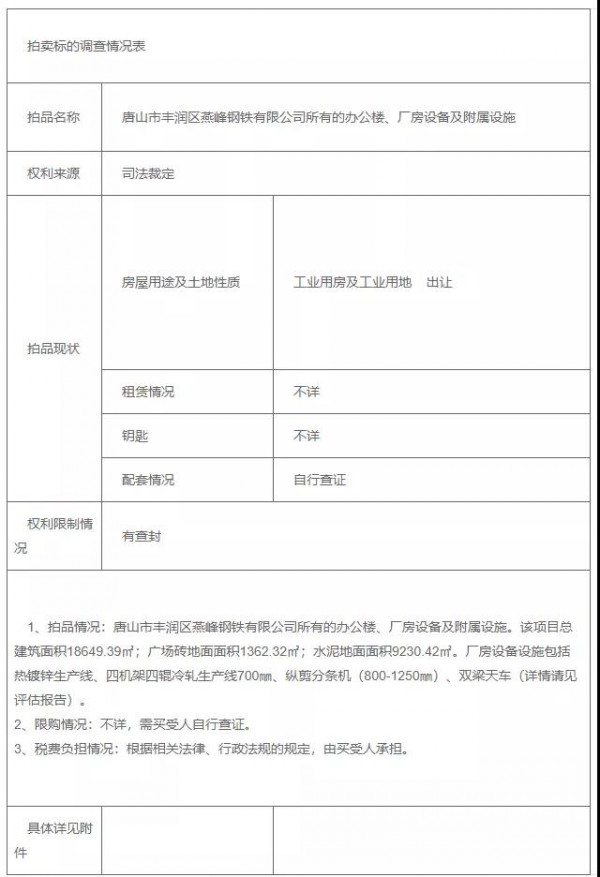 核心提示:8月25日,唐山市中級(jí)人民法院發(fā)布《關(guān)于唐山市豐潤(rùn)區(qū)燕峰鋼鐵有限公司所有的辦公樓、廠房設(shè)備及附屬設(shè)施的拍賣公告》。該公告表
