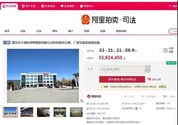 8月25日,唐山市中級(jí)人民法院發(fā)布《關(guān)于唐山市豐潤(rùn)區(qū)燕峰鋼鐵有限公司所有的辦公樓、廠房設(shè)備及附屬設(shè)施的拍賣公告》。該公告表示,將在淘寶網(wǎng)司法拍賣網(wǎng)絡(luò)平臺(tái)上對(duì)唐山市豐潤(rùn)區(qū)燕峰鋼鐵有限公司相關(guān)資產(chǎn)進(jìn)行公開(kāi)拍賣,起拍價(jià)為33924450元。