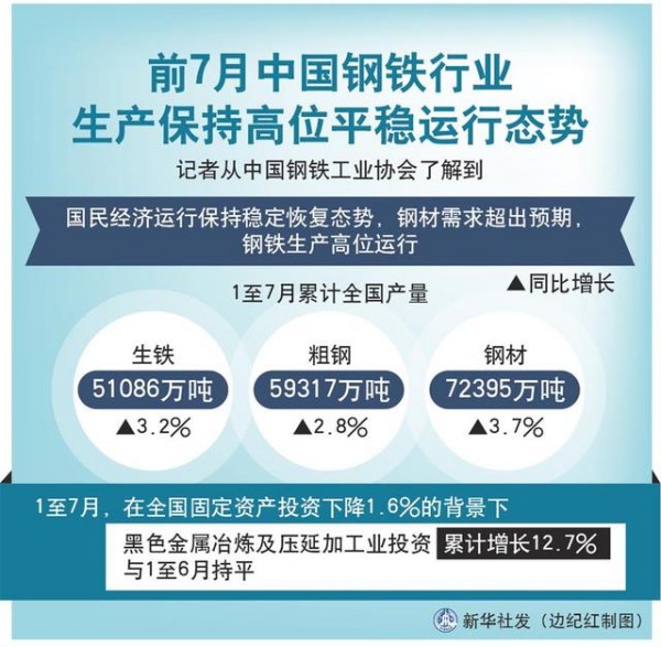 記者從中國鋼鐵工業(yè)協(xié)會了解到,今年1至7月全國鋼鐵產(chǎn)量持續(xù)增長,有效滿足了下游需求,行業(yè)運行情況持續(xù)向好。