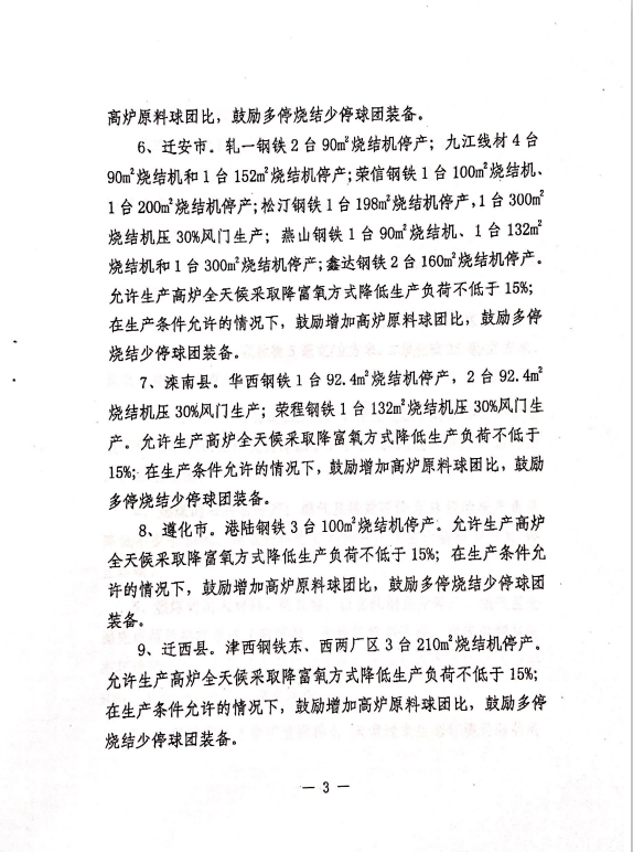 6、遷安市。軋一鋼鐵2臺90m°燒結(jié)機停產(chǎn);九江線材4臺90m燒結(jié)機和1臺152m2燒結(jié)機停產(chǎn);榮信鋼鐵1臺100m2燒結(jié)機、1臺200m2燒結(jié)機停產(chǎn);松汀鋼鐵1臺198m2燒結(jié)機停產(chǎn),1臺300m2燒結(jié)機壓30%風門生產(chǎn);燕山鋼鐵1臺90m燒結(jié)機、1臺132m2燒結(jié)機和1臺300m2燒結(jié)機停產(chǎn);鑫達鋼鐵2臺160m2燒結(jié)機停產(chǎn).允許生產(chǎn)高爐全天候采取降富氧方式降低生產(chǎn)負荷不低于15%;在生產(chǎn)條件允許的情況下,鼓勵增加高爐原料球團比,鼓勵多停燒結(jié)少停球團裝備。