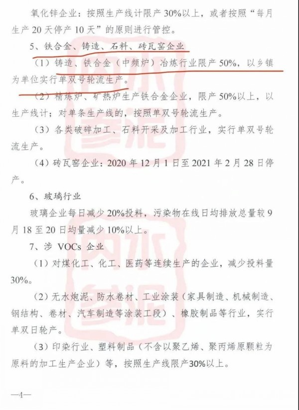 (1)鑄造、鐵合金(中頻電爐)冶煉行業(yè)限產(chǎn)50%,以鄉(xiāng)鎮(zhèn)為單位實(shí)行單雙號(hào)輪流生產(chǎn)。