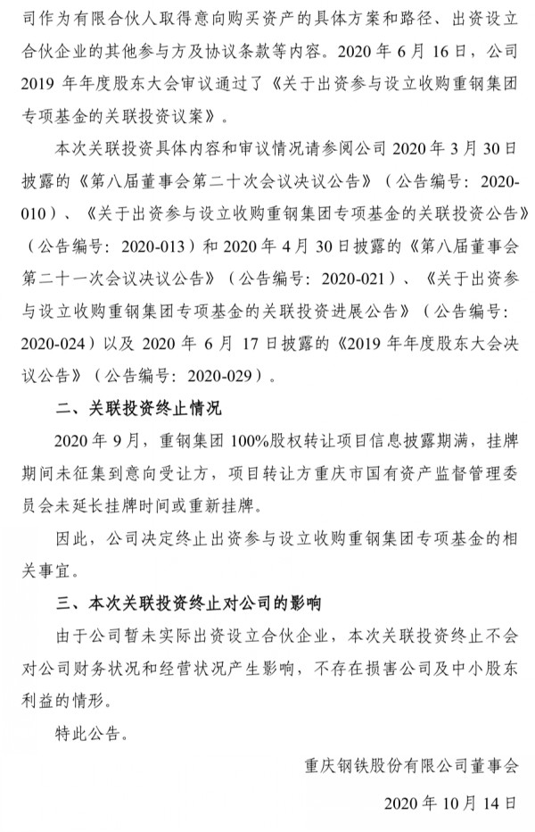 2019年12月27日,四源合投資與中國寶武鋼鐵集團簽署了《意向書》,中國寶武成為重慶鋼鐵的實際控制人。根據(jù)《意向書》,將由中國寶武指定的法律實體,受讓四源合投資持有的四源合重慶基金普通合伙人份額,從而成為該基金的管理人。