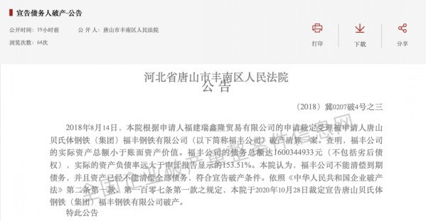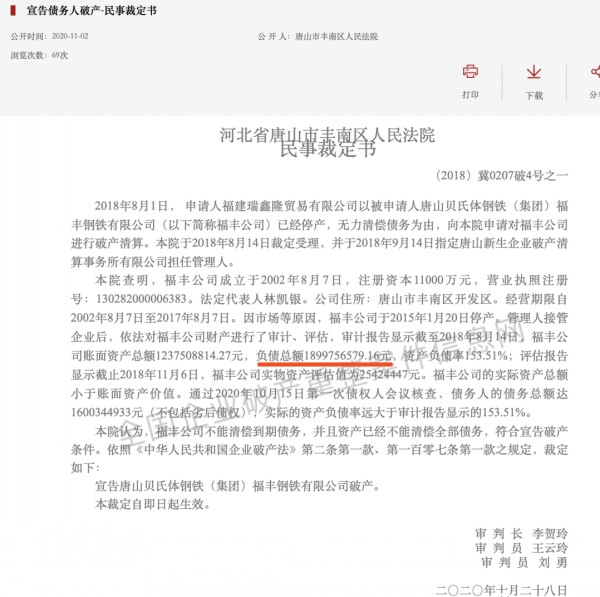 唐山貝氏體鋼鐵(集團(tuán))福豐鋼鐵有限公司成立于2002年8月,注冊(cè)資本11000萬(wàn)元,公司股東為宋大林、林凱銀、鄭凱翔、李誠(chéng)、黃曦。經(jīng)營(yíng)范圍為煉鋼、軋鋼、黑色金屬加工、氧氣、氮?dú)庵圃斓?。公司法定代表人林凱銀,公司員工千人以上。2015年公司停產(chǎn),并列入國(guó)家去產(chǎn)能鋼鐵企業(yè)。2018年8月1日,公司債權(quán)人福建瑞鑫隆貿(mào)易有限公司向本院申請(qǐng)債務(wù)人唐山貝氏體鋼鐵(集團(tuán))福豐鋼鐵有限公司破產(chǎn)清算。