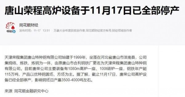 截至11月17日,唐榮公司高爐設備已經(jīng)全部停產(chǎn),影響鋼坯日產(chǎn)量3500-4000噸左右。后續(xù)唐榮公司涉及退城搬遷情況,我們將持續(xù)跟蹤。