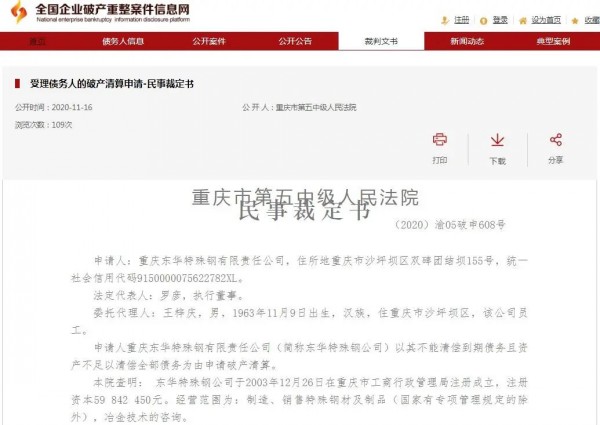 11月16日,全國(guó)企業(yè)破產(chǎn)重整案件信息網(wǎng)發(fā)布《重慶市第五中級(jí)人民法院民事裁定書(shū)》,重慶市第五中級(jí)人民法院認(rèn)為,重慶東華特殊鋼有限責(zé)任公司不能清償?shù)狡趥鶆?wù)且資產(chǎn)不足以清償全部債務(wù)。因此東華特殊鋼公司申請(qǐng)破產(chǎn)清算符合法律規(guī)定,裁定受理重慶東華特殊鋼有限責(zé)任公司的破產(chǎn)清算申請(qǐng)。