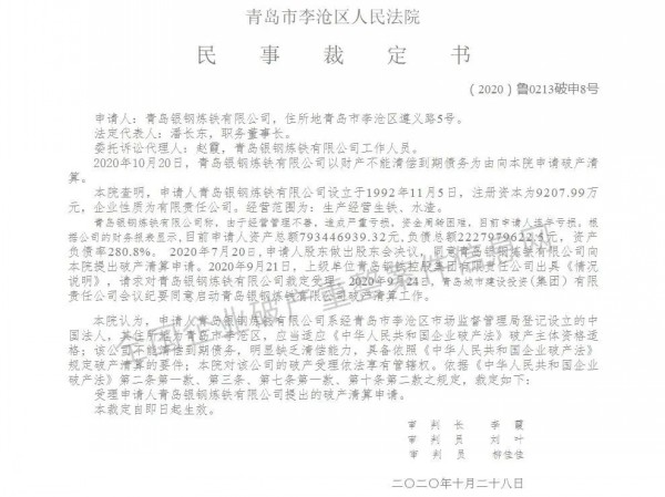 2020年10月20日,青島銀鋼煉鐵有限公司以財(cái)產(chǎn)不能清償?shù)狡趥鶆?wù)為由向青島市李滄區(qū)人民法院申請(qǐng)破產(chǎn)清算。青島銀鋼煉鐵有限公司稱(chēng),由于經(jīng)營(yíng)管理不善,造成嚴(yán)重虧損,資金周轉(zhuǎn)困難,目前申請(qǐng)人連年虧損。青島市李滄區(qū)人民法院認(rèn)為該公司不能清償?shù)狡趥鶆?wù),明顯缺乏清償能力,裁定受理青島銀鋼煉鐵有限公司提出的破產(chǎn)清算申請(qǐng)。