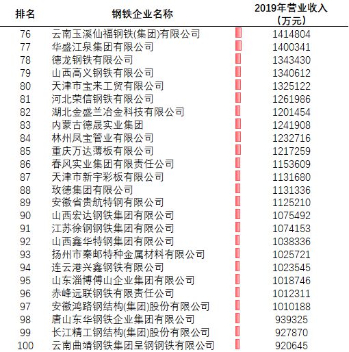 除了中國寶武、河鋼集團(tuán)、鞍鋼集團(tuán)、首鋼集團(tuán)等巨頭外,行業(yè)里還有一大批實力不俗的民營企業(yè),產(chǎn)量占比超過六成。究竟誰才是“領(lǐng)頭羊”,2020年百強民營鋼鐵企業(yè)排名可以給我們答案。根據(jù)各家民營鋼鐵企業(yè)去年也就是2019年度營業(yè)收入進(jìn)行排名,前100名如下: