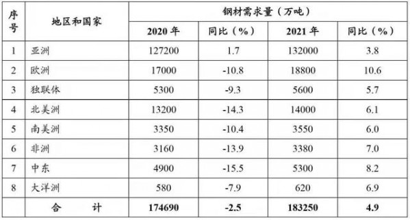 (2020年和2021年全球主要地區(qū)鋼材需求預測情況)