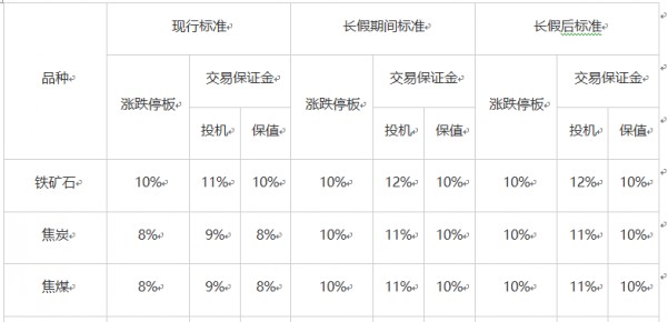 2021年1月4日(星期一)恢復交易后,鐵礦石、焦炭、焦煤、黃大豆1號、棕櫚油、玉米和雞蛋品種期貨合約漲跌停板幅度和交易保證金水平維持假期期間標準不變;其他品種期貨合約漲跌停板幅度和交易保證金水平維持不變。