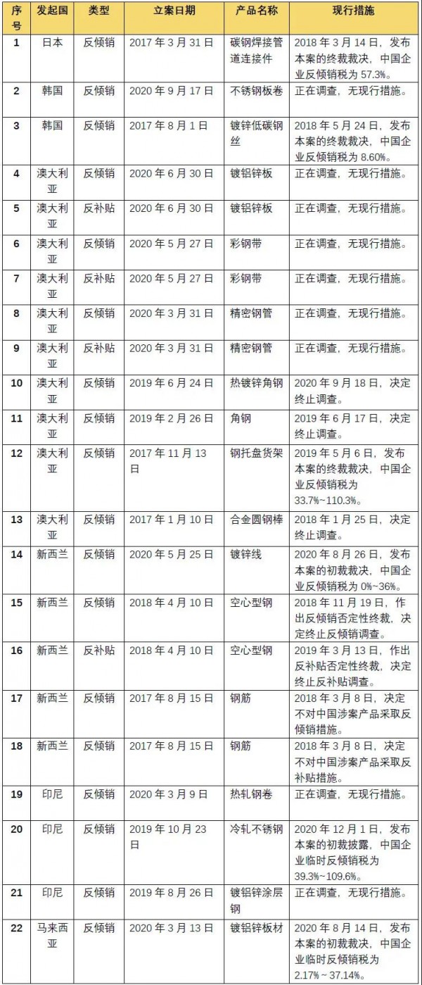 2017-2020年期間,反傾銷調(diào)查方面,以澳大利亞發(fā)起立案調(diào)查數(shù)量最多居首位,共7起。但值得注意的是,除2020年最新立案的3起調(diào)查還未發(fā)布措施外,其余4起案件中有3起均以終止調(diào)查結(jié)案。馬來西亞、泰國和新西蘭以4起新立案位列第二,且在馬來西亞對華鍍鋅鐵案中裁定出0的最低反傾銷稅率。印尼緊隨其后,分別在2019-2020年期間對中國發(fā)起3起反傾銷原審立案調(diào)查,其中,兩起無現(xiàn)行措施,一起發(fā)布初裁披露。韓國和越南對中國進(jìn)口鋼鐵類產(chǎn)品各發(fā)起2起反傾銷調(diào)查。最后是日本,于2017年對中國進(jìn)口碳鋼焊接管道連接件產(chǎn)品發(fā)起反傾銷調(diào)查。反補(bǔ)貼調(diào)查方面,澳大利亞于2020年啟動共3起對華原審立案調(diào)查,目前正在調(diào)查中,無現(xiàn)行措施。新西蘭于2018年就進(jìn)口自中國的空心型鋼發(fā)起反補(bǔ)貼調(diào)查,但最終認(rèn)定補(bǔ)貼幅度低于2%,不會對新西蘭產(chǎn)業(yè)造成實(shí)質(zhì)性損害。