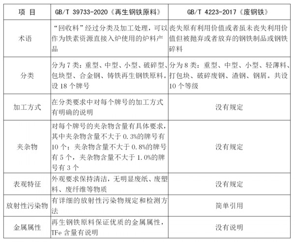 GB/T 39733-2020《再生鋼鐵原料》與GB/T 4223-2017《廢鋼鐵》國(guó)家標(biāo)準(zhǔn)的主要區(qū)別見(jiàn)表1。