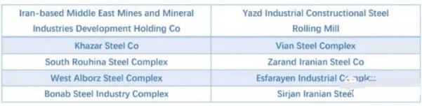 被列入黑名單的12家伊朗公司包括帕薩加德鋼鐵集團(tuán)(Pasargad Steel Complex)和吉蘭鋼鐵集團(tuán)公司(Gilan Steel Complex),這兩家公司都是根據(jù)13871號行政令被指定從事伊朗鋼鐵行業(yè)的業(yè)務(wù)。被制裁的另外十家伊朗鋼鐵企業(yè)如下圖所示。
